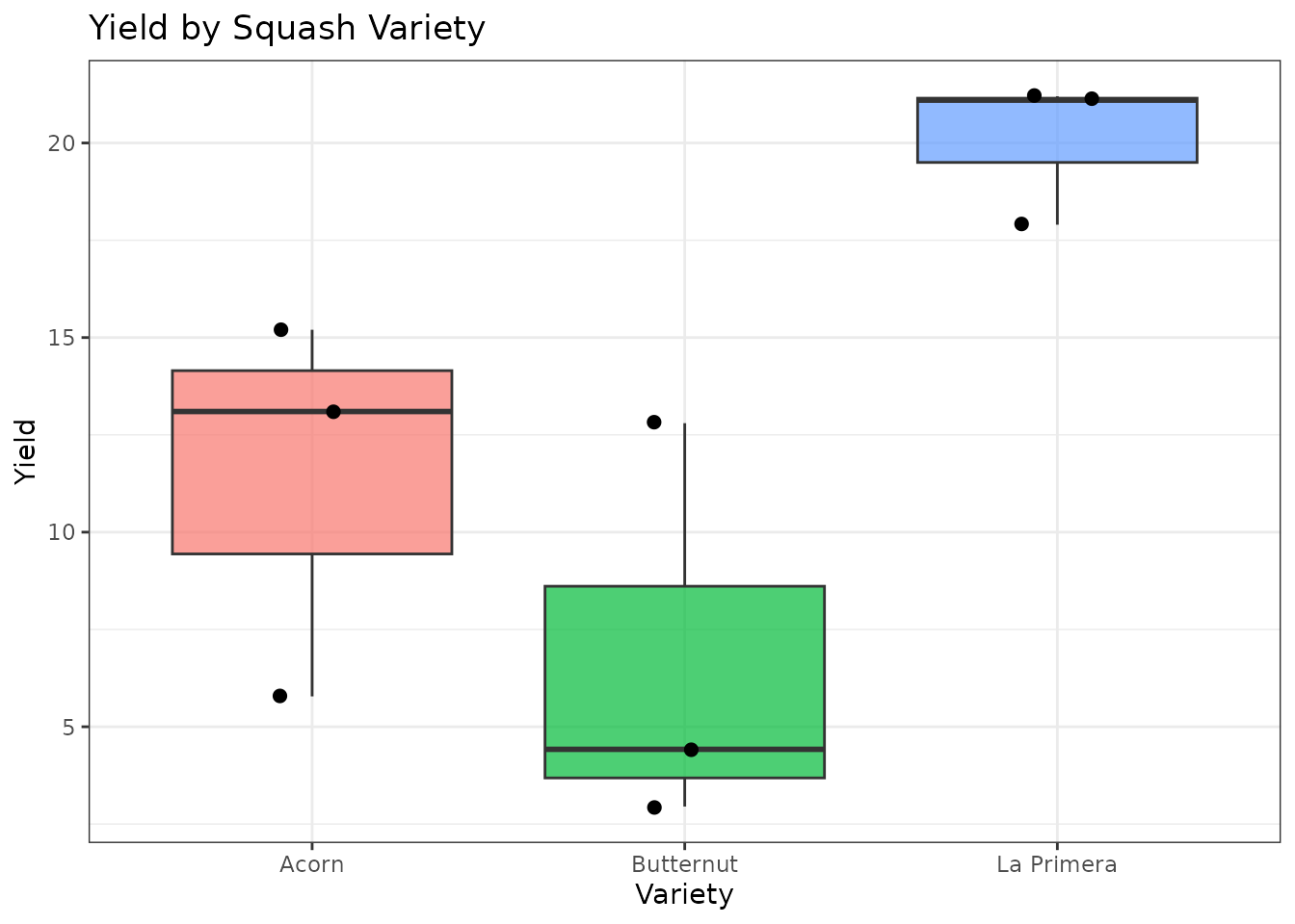 labs(title = "Yield by Squash Variety", y = "Yield", x = "Variety") +