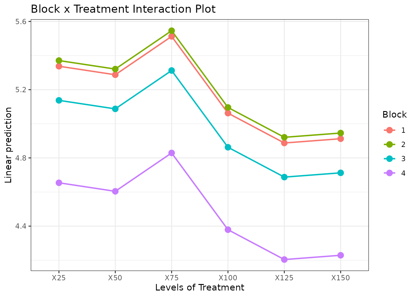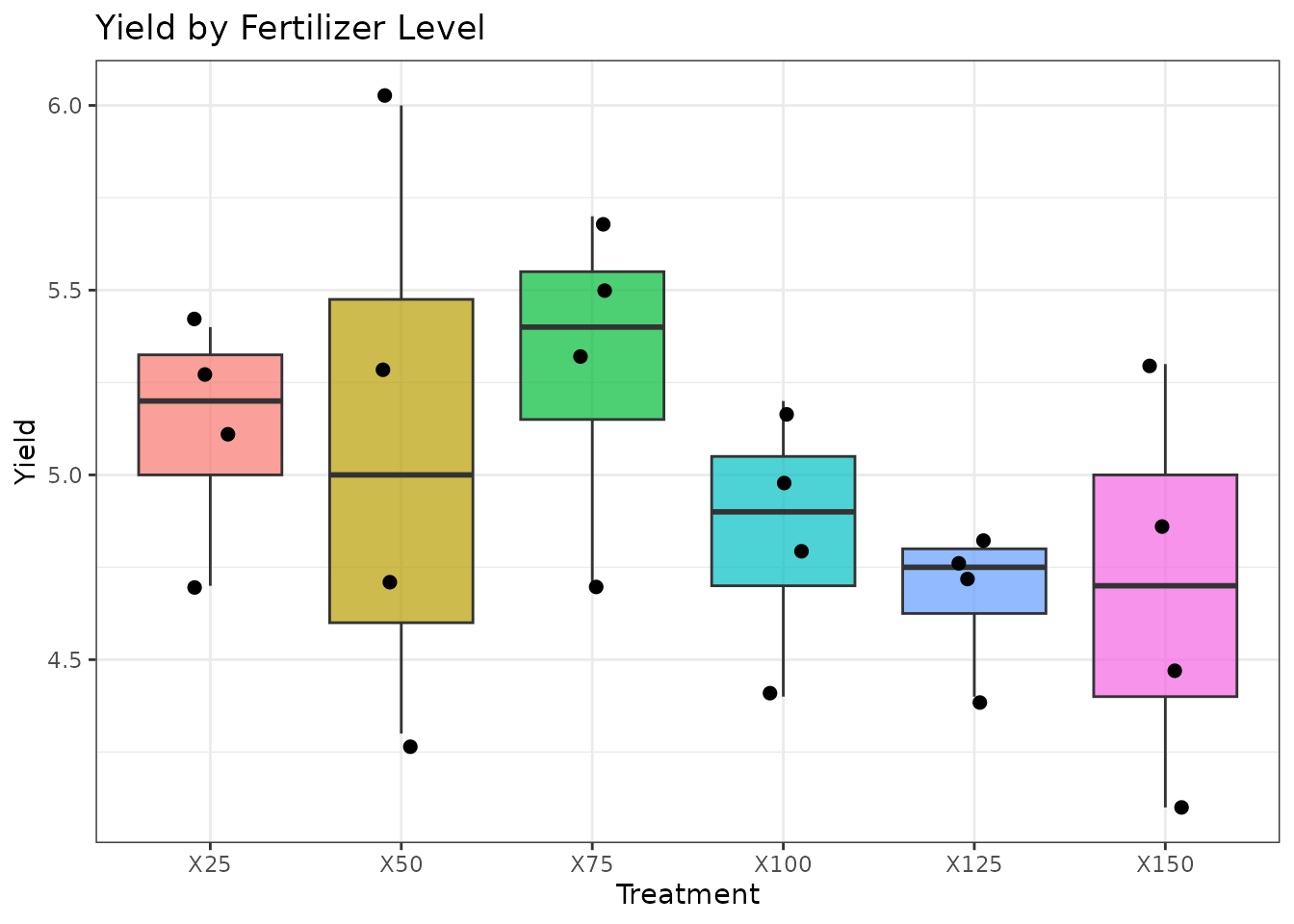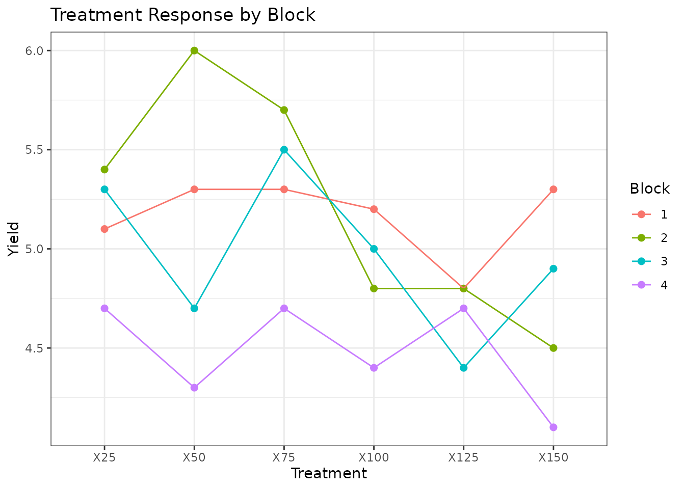 We use a dataset with six fertilizer levels (X25 through X150) applied across four blocks.